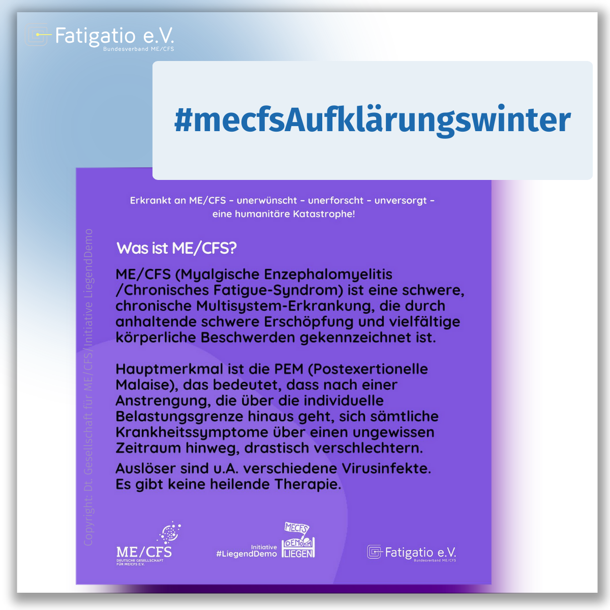 Die bundesweite Poster-Aufklärungsaktion zu ME/CFS von der Initiative LiegendDemo und Deutsche Gesellschaft für ME/CFS wird unterstützt vom Fatigatio e.V. und startet im November 2024 mit dem Ziel über ME/CFS aufzuklären, das Bewusstsein für diese schwere Erkrankung zu stärken und Veränderung zu bewirken.